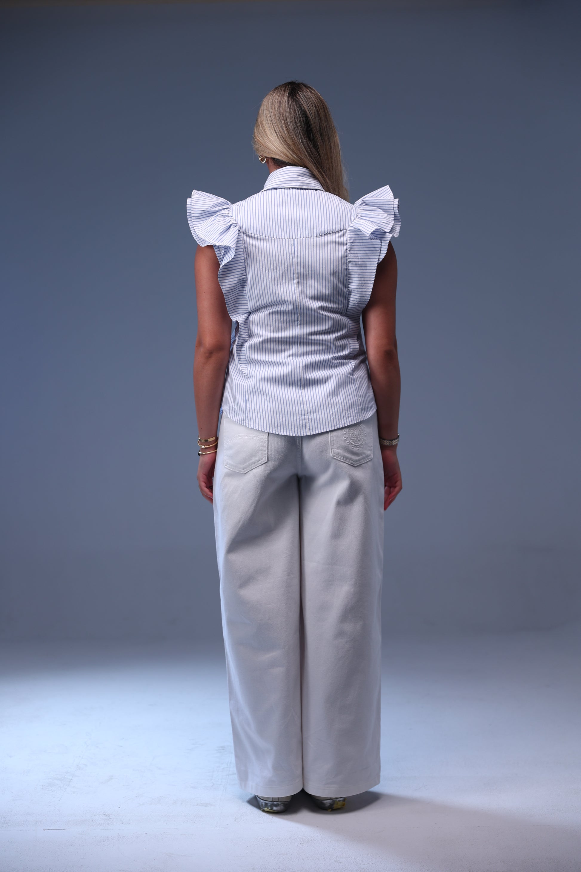 Elevate your wardrobe with our elegant Ruffled Bow-Front Sleeveless Blouse, crafted in lightweight cotton with subtle vertical stripes for a timeless touch. Featuring statement ruffled sleeves and a soft bow at the collar, this piece pairs perfectly with both tailored trousers and denim for a refined yet effortless look.
