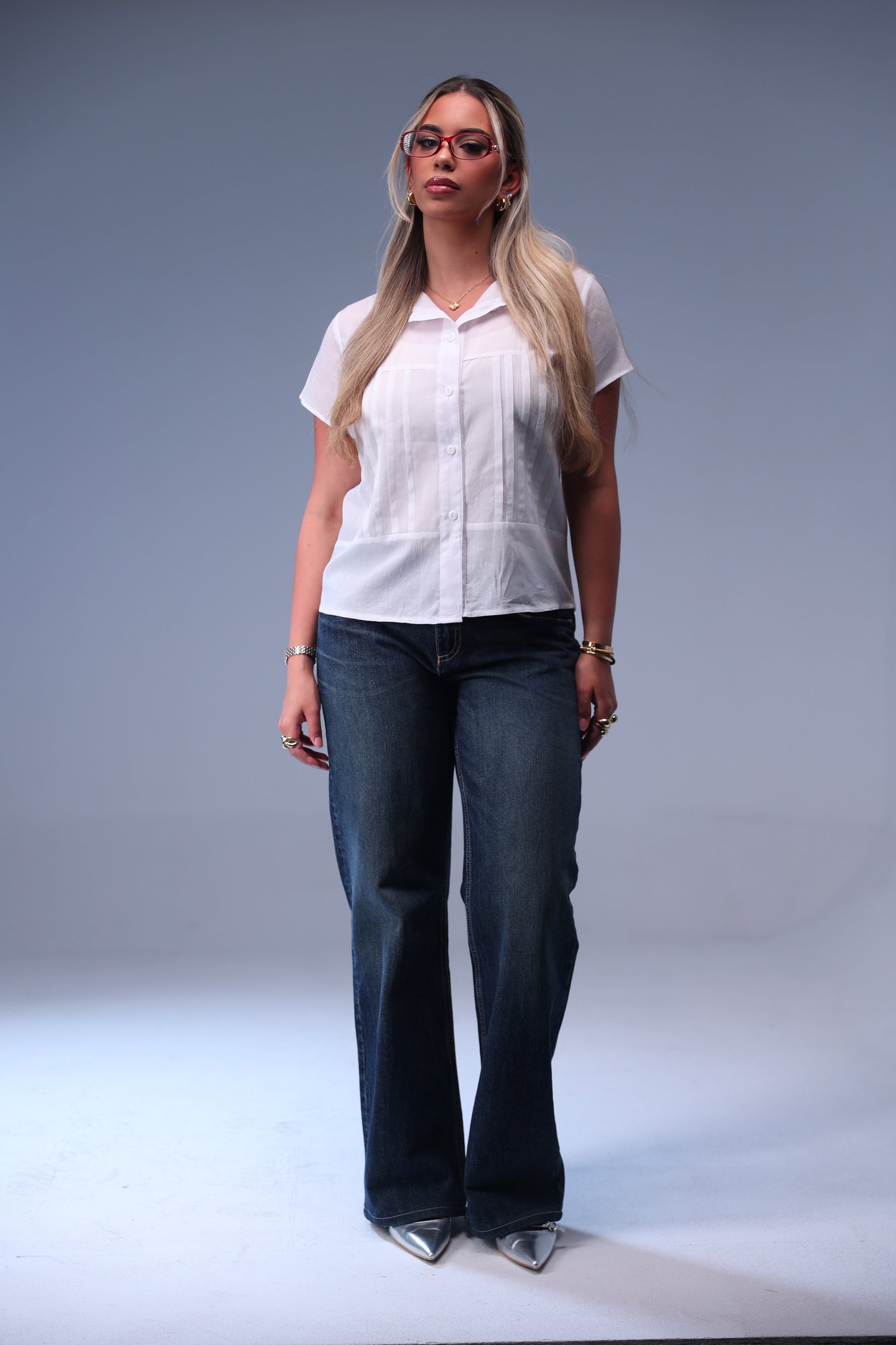 Elevate your wardrobe with our Classic White Button-Up Blouse — a timeless staple that blends sophistication with comfort. Featuring short sleeves, a charming rounded collar, and delicate vertical pintuck pleats, this blouse brings a touch of vintage flair to your modern-day look.